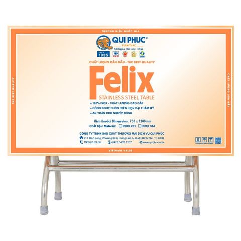 Bàn inox FELIX 700 x 1200 (mm) 4U 201 cạnh ép mặt trơn Quy Phúc 1000000023 là lựa chọn lý tưởng cho những ai đang tìm kiếm một chiếc bàn inox bền đẹp, chắc chắn và dễ vệ sinh. Với thiết kế hiện đại cùng chất liệu inox 201 cao cấp, sản phẩm mang lại sự tiện lợi và độ bền cao cho nhiều không gian sử dụng.