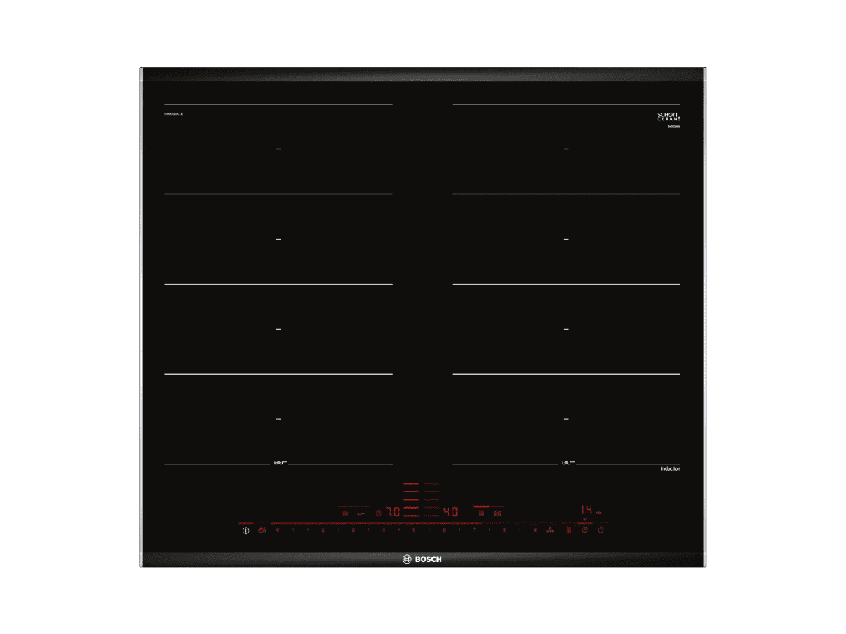 Hệ thống điều khiển cảm ứng Direct Select Premium của bếp từ Bosch PXX675DC1E mang đến trải nghiệm sử dụng tuyệt vời. Cảm ứng cực nhạy cho phép bạn dễ dàng lựa chọn vùng nấu, mức công suất và các chức năng khác chỉ bằng một lần chạm nhẹ. Màn hình hiển thị rõ ràng, dễ đọc giúp bạn theo dõi và điều chỉnh các thiết lập một cách chính xác và tiện lợi.