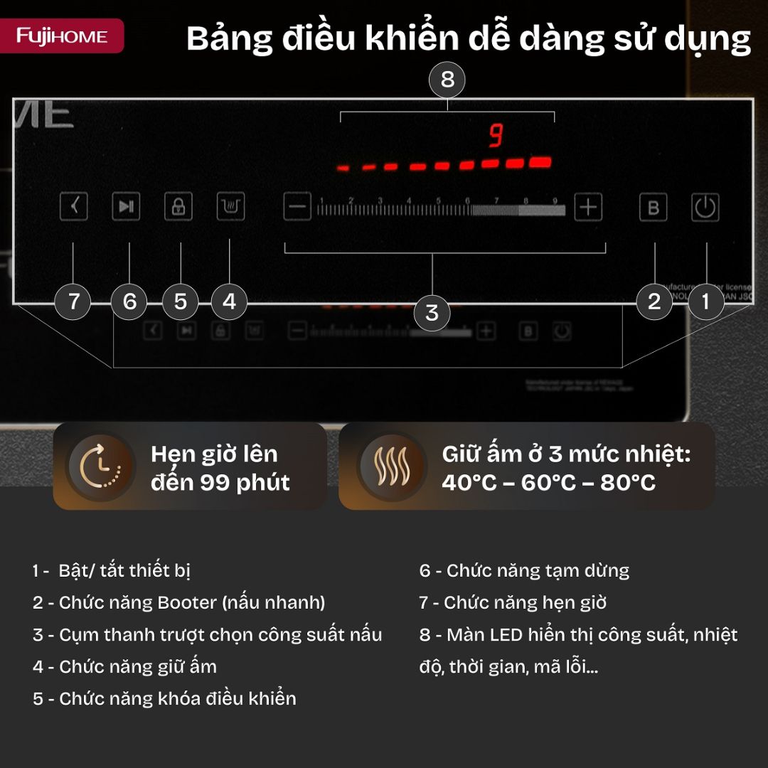 Chức năng tạm dừng (Pause): Dừng bếp tạm thời, tiếp tục nấu mà không cần cài đặt lại.