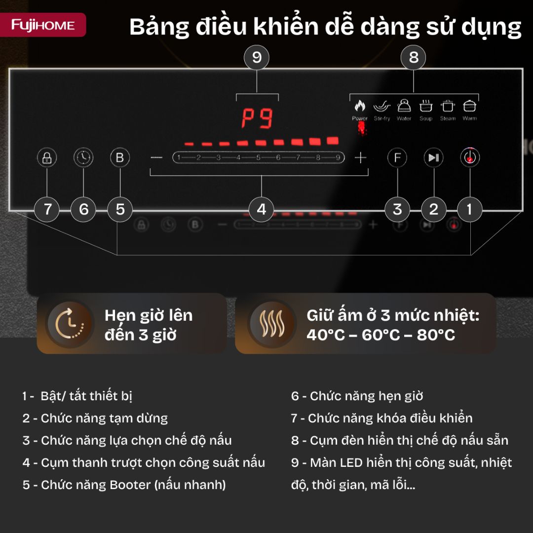Hẹn giờ lên đến 3 giờ: Giúp người dùng chủ động thời gian nấu, không cần đứng bếp liên tục.