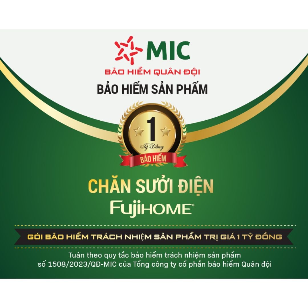 Chăn sưởi Fujihome HB1820PRO được Bảo hiểm Quân Đội MIC bảo hiểm trách nhiệm sản phẩm lên đến 1 tỷ đồng, đảm bảo quyền lợi và sự an tâm tuyệt đối cho người sử dụng.
