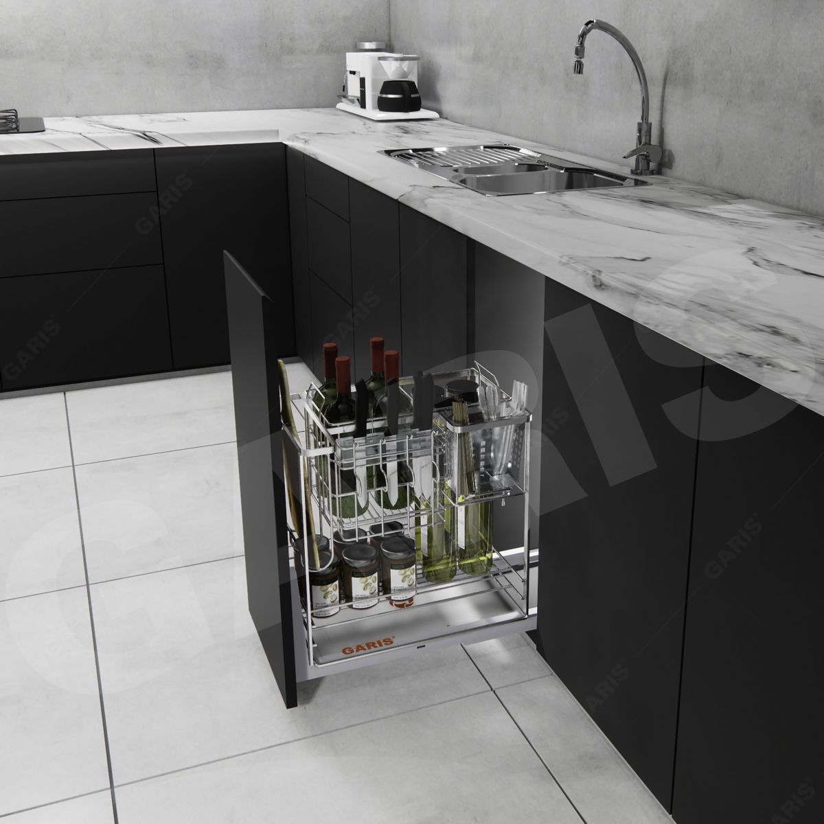 Ray trượt: ray âm giảm chấn Garis (bắt đáy tủ), đóng mở êm ái.