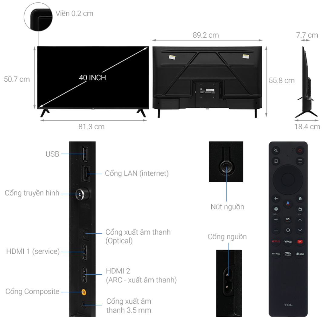 Thông số kỹ thuật Google Tivi QLED TCL 40S5K