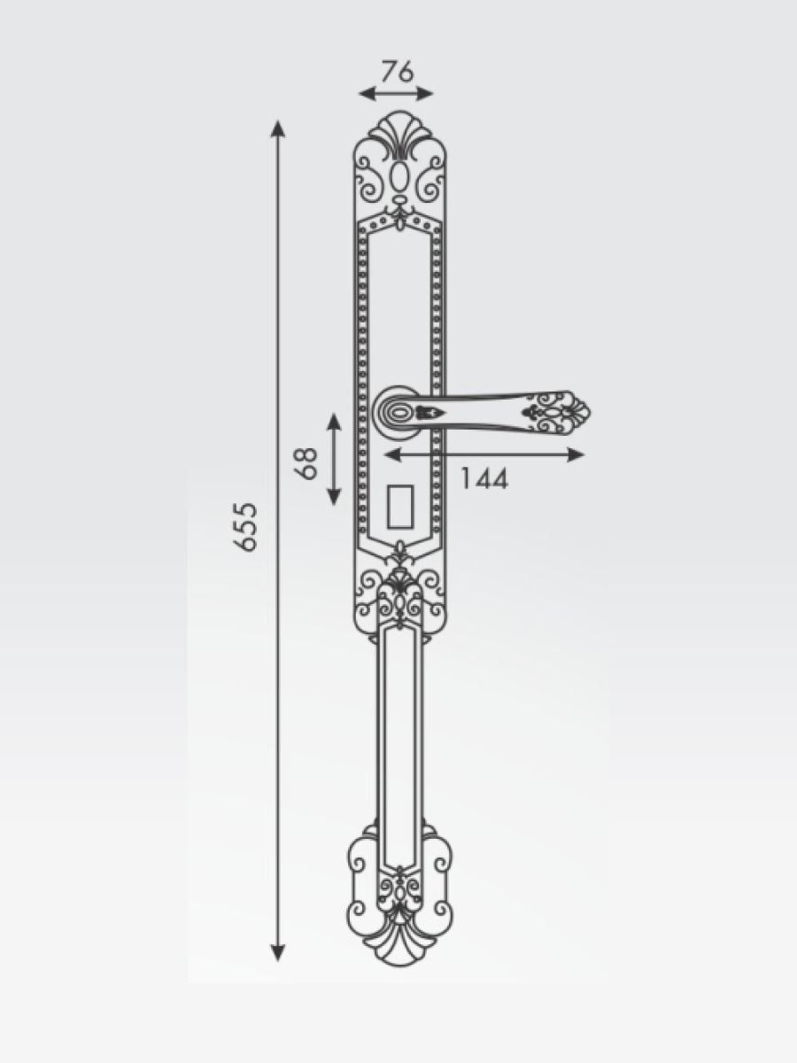 - Kích Thước Thân Khóa Ngoài: R 76 x C 655 x D 34mm, phù hợp với các cửa đại sảnh lớn và chắc chắn.
