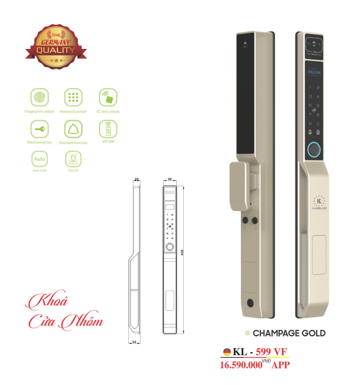 Khóa cửa nhôm vân tay Kassler KL-599VF Champagne Gold là sản phẩm đột phá của thương hiệu Kassler, đến từ Đức, nổi bật với thiết kế sang trọng và tính năng vượt trội.