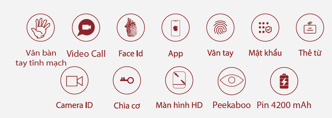 - Vận hành bằng tĩnh mạch lòng bàn tay, mật mã, vân tay, thẻ từ, chìa khóa cơ, App Tuya, Video Call, Face ID 3D