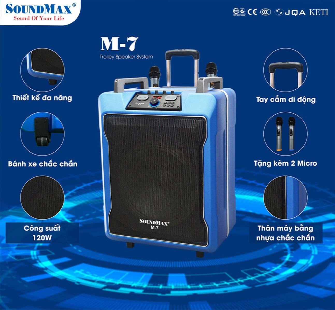 Âm Thanh Mạnh Mẽ, Đầy Cảm Xúc Với tổng công suất 120W, SoundMax M-7 cung cấp âm thanh mạnh mẽ, với bass trầm ấm, âm trung rõ ràng và âm cao trong trẻo. Loa hứa hẹn sẽ thổi bùng cảm xúc và mang đến không gian âm nhạc sống động, đầy sức hút trong mọi dịp tụ họp.