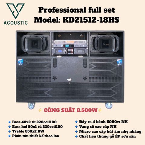 Loa điện Acoustic KD21512-18HS là dòng loa chuyên nghiệp được thiết kế dành cho các sân khấu lớn, hội trường, sự kiện ngoài trời… với công suất khủng lên đến 8.500W, mang lại âm thanh mạnh mẽ và sống động.