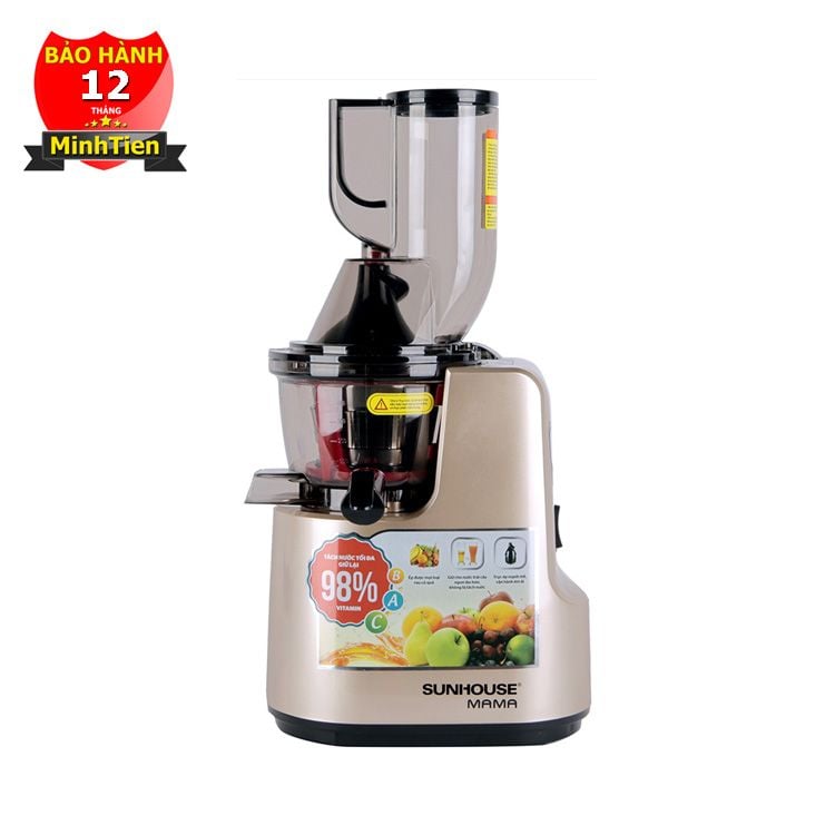 - Máy ép chậm Sunhouse SHD 5210 máy sử dụng công nghệ ép chậm giúp giữ được 98% vitamin của hoa quả. Máy ép có công suất 240W được thiết kế sang trọng với sự kết hợp của 2 màu vàng và đồng. Máy ép còn có khóa an toàn và chế độ tự ngắt khi quá nhiệt. Đặc biệt máy còn có chế độ tự làm sạch khi sử dụng xong. Máy ép có trục ép mạnh giúp tách nước tối đa phù hợp cho mọi gia đình.