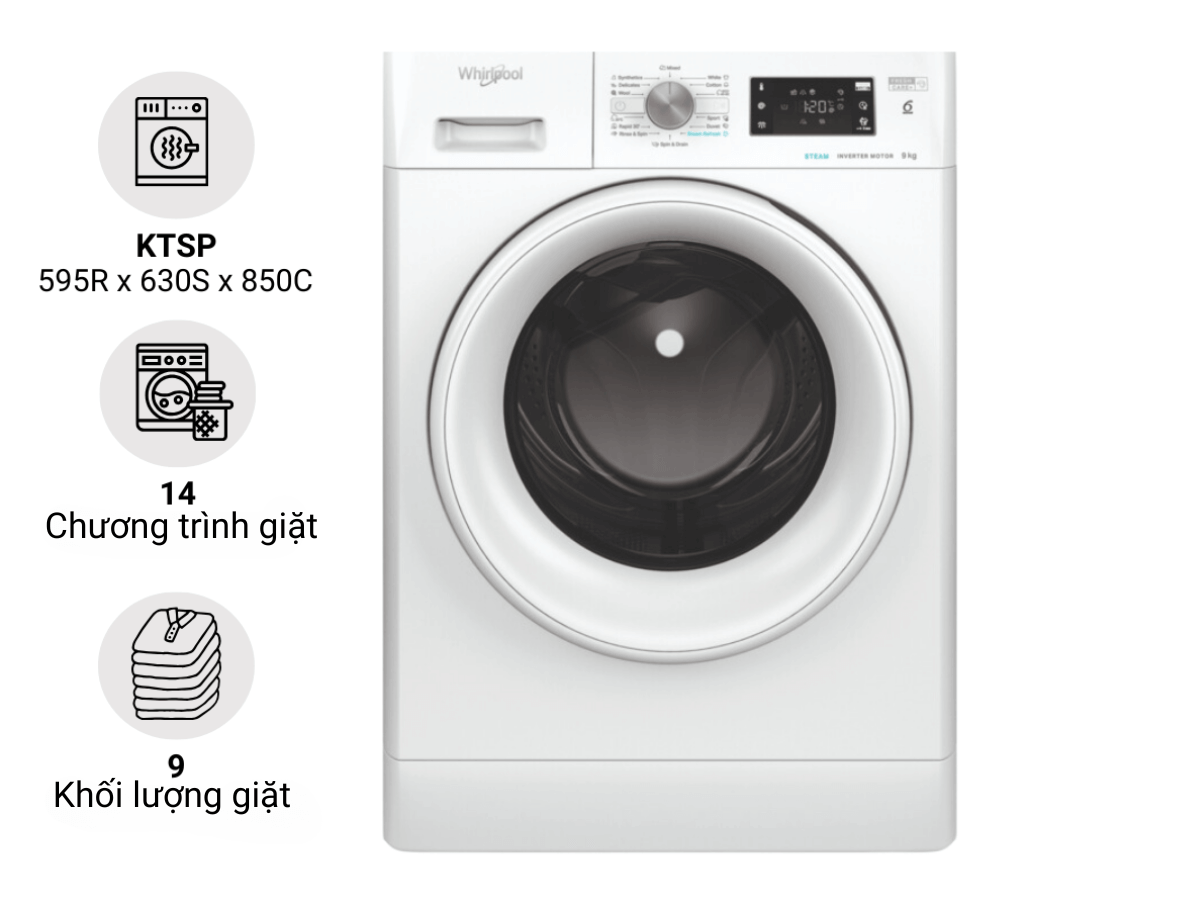 - Máy giặt Whirlpool FFB9458 WV EE với khối lượng giặt 9kg, đáp ứng hoàn hảo nhu cầu giặt giũ của gia đình từ 3-5 người.