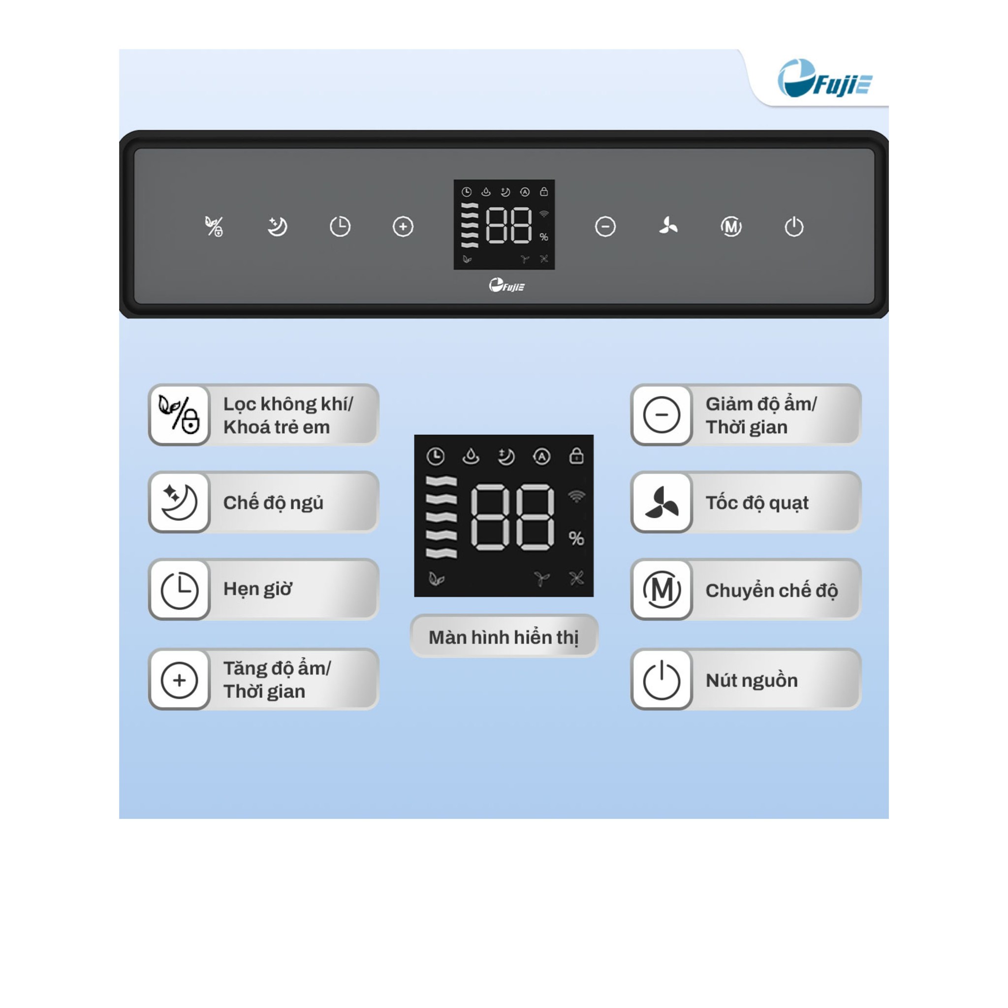 Màn hình LED kích thước lớn, hiển thị rõ ràng độ ẩm và trạng thái hoạt động
