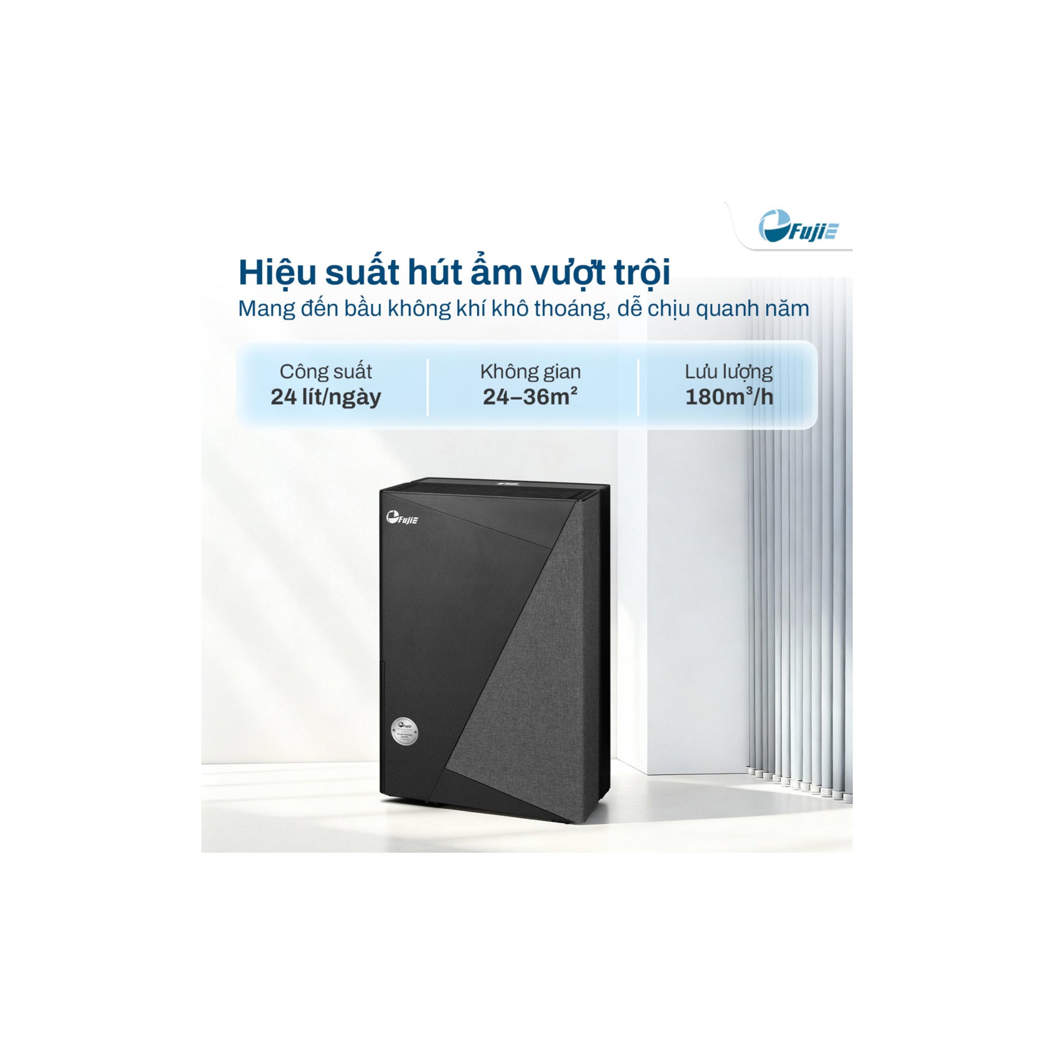 Máy hút ẩm FujiE HM-924ED là lựa chọn hoàn hảo cho phòng ngủ lớn, phòng khách, phòng làm việc, phòng tắm nắng, studio hoặc các không gian từ 24–36m².