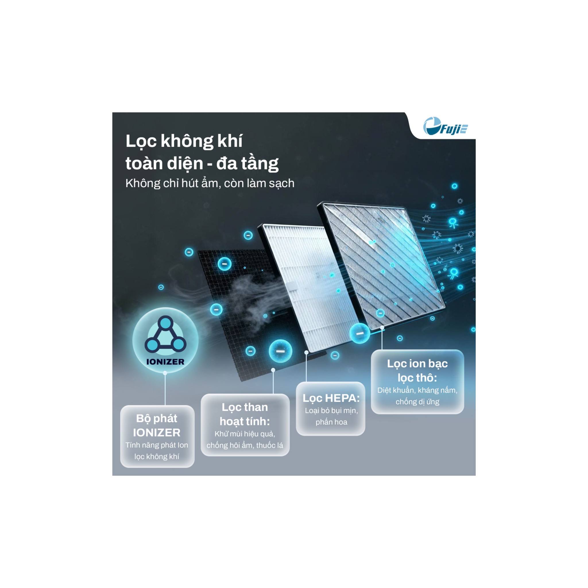 🌟 3. Lọc không khí đa tầng – Hút ẩm + Khử mùi + Diệt khuẩn