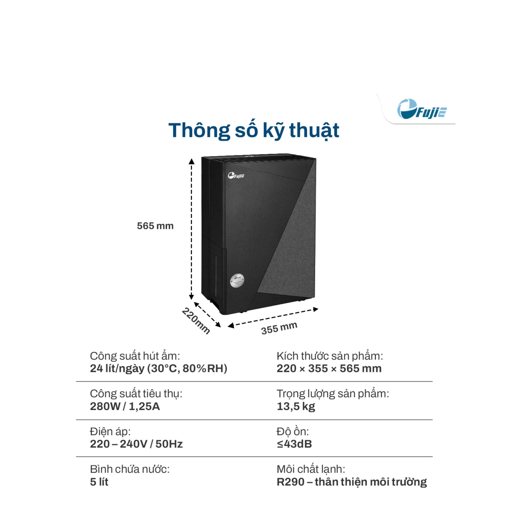 | Công suất hút ẩm | 24 lít/ngày (30°C – 80%RH) |