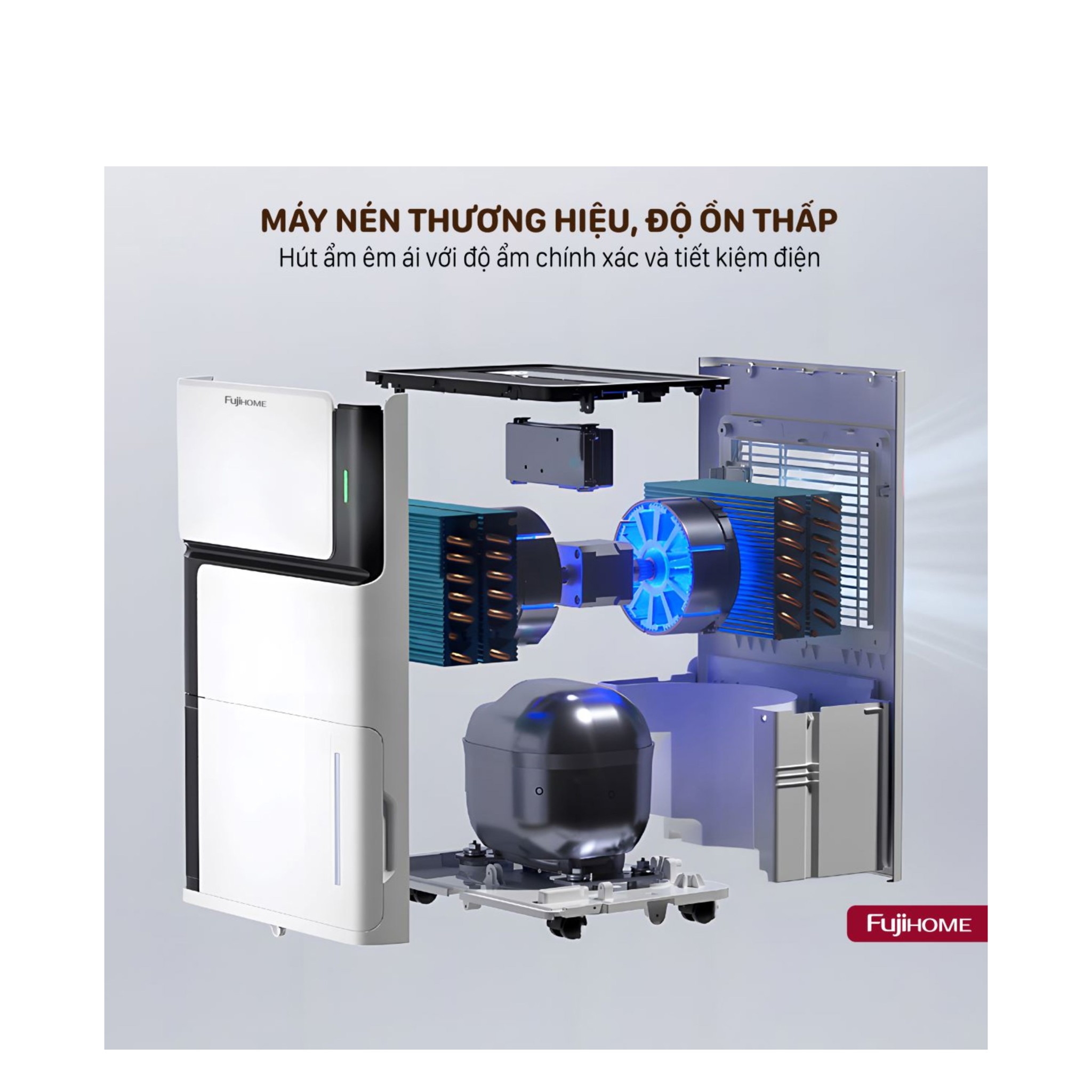 Fujihome DH07 sử dụng công nghệ hút ẩm bằng máy nén (block compressor) – giải pháp cho hiệu suất ổn định và bền bỉ, vượt trội hơn công nghệ chip điện tử chỉ phù hợp cho không gian rất nhỏ.