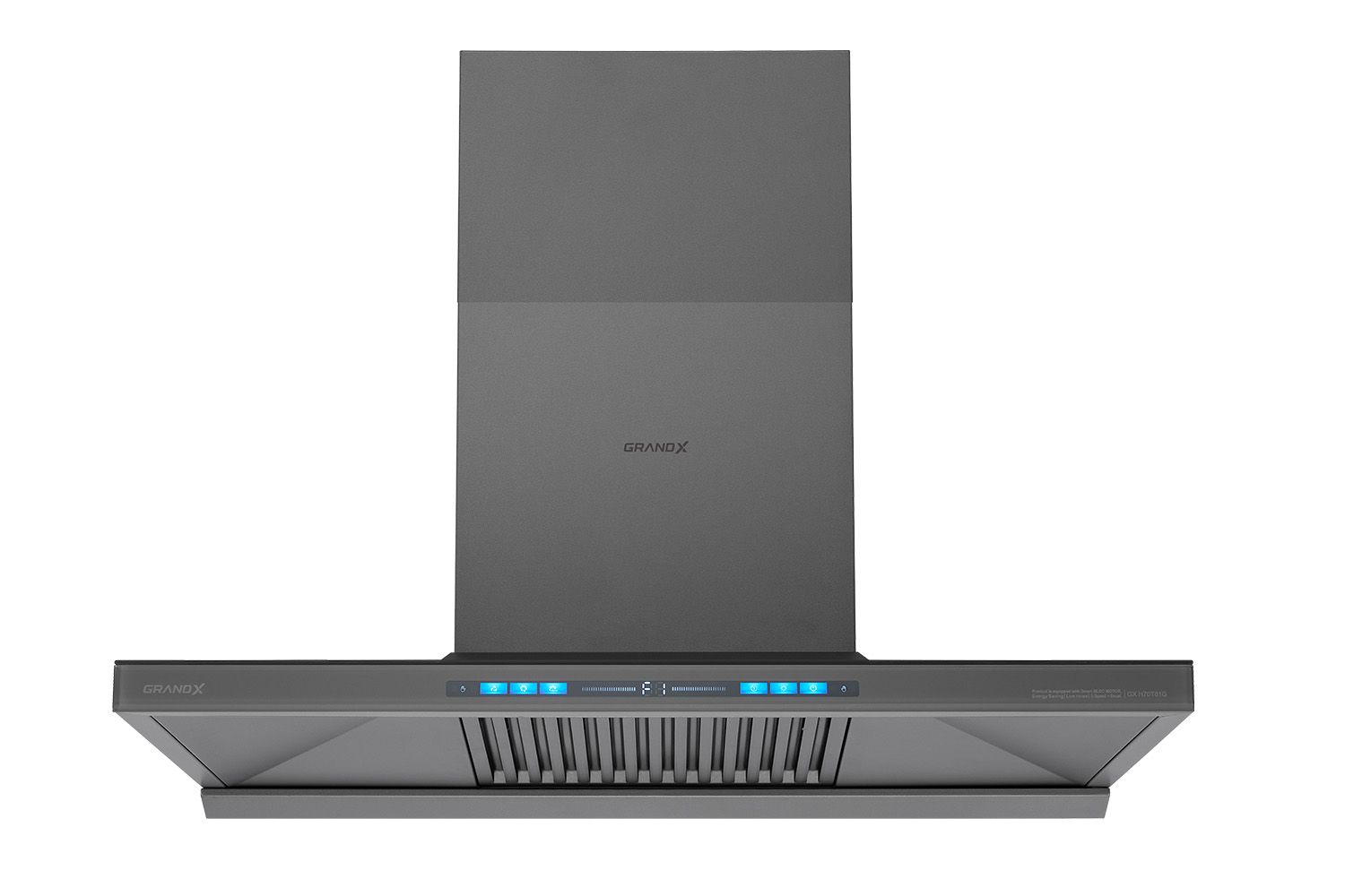Máy hút mùi GrandX GX H70T81G được thiết kế theo phong cách T-Shaped hình phễu hiện đại. Kính cường lực màu dày 6mm, vát nghiêng 3 cạnh độc đáo giúp tạo điểm nhấn ấn tượng cho không gian bếp và dễ lau chùi.