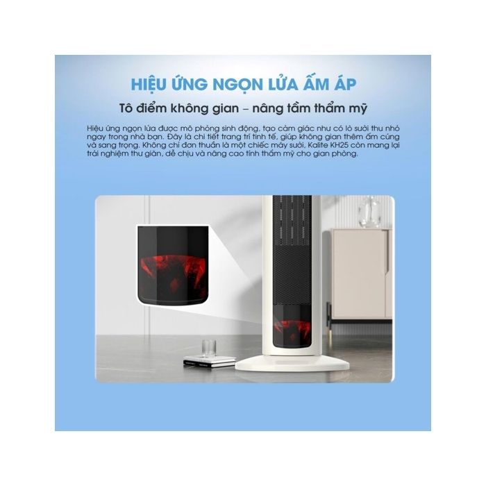 Hiệu ứng ngọn lửa trên Kalite KH25 được mô phỏng sống động như một lò sưởi mini, mang lại cảm giác ấm cúng và thư giãn. Không chỉ xua tan cái lạnh, máy còn góp phần tăng tính thẩm mỹ, phù hợp với nhiều phong cách nội thất hiện đại.