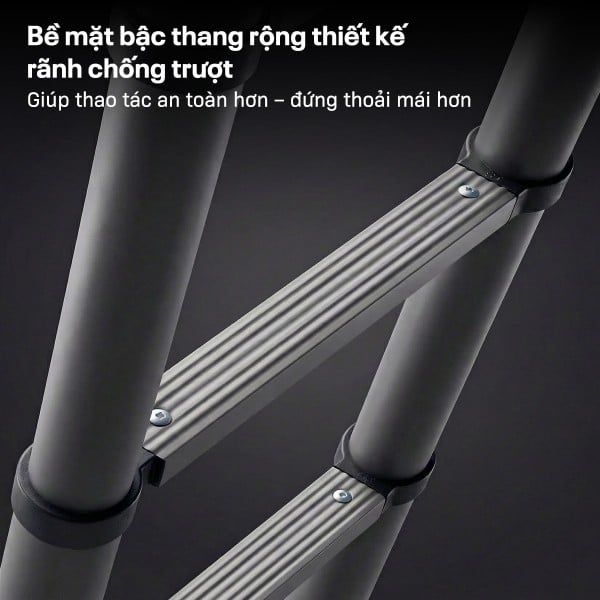 Bề mặt thang được hoàn thiện bằng công nghệ phủ màng nhựa Plastic Powder Coating cao cấp, tạo lớp bảo vệ chắc chắn và bền bỉ theo thời gian:
