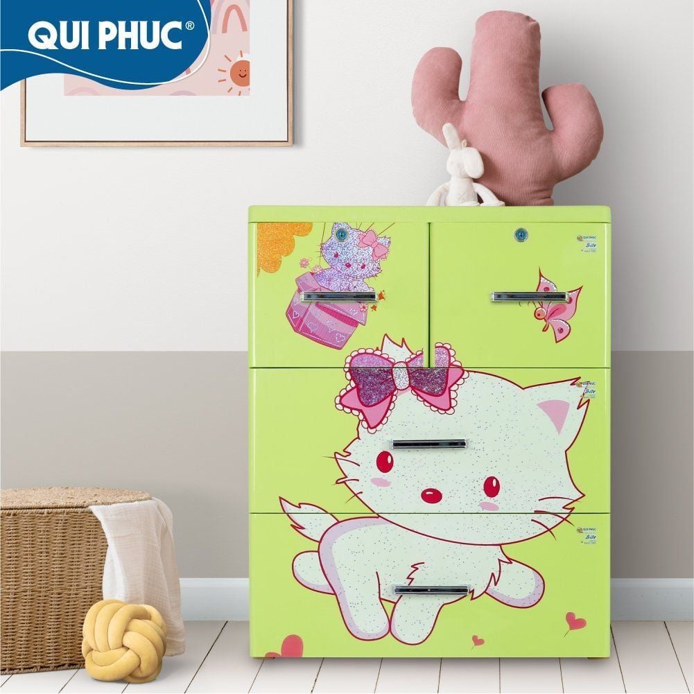 Tủ được tích hợp bánh xe mini trục ngang, giúp việc di chuyển trở nên nhẹ nhàng mà không làm trầy xước sàn. Họa tiết ngộ nghĩnh, nhiều màu sắc bắt mắt phù hợp với sở thích của trẻ nhỏ, đồng thời tăng tính thẩm mỹ cho không gian phòng bé.